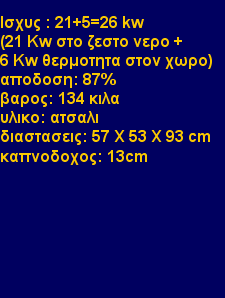 | Σομπα καλοριφερ Τ35 Η σομπα ξυλου Τ35 διαθετει υδροθαλαμο θερμανσης νερου για συνδεση με δικτυο καλοριφερ. Στο πισω μερος της σομπας βρισκονται εισοδος κρυου και εξοδος ζεστου νερου. Οι υδροθαλαμοι ειναι τοποθετημενοι στα διπλα τοιχωματα της σομπας ξυλου Τ35. Η σομπα ξυλου απο ατσαλι T35 ειναι μια ενεργειακη σομπα με αποδοση 87%. ο χωρος καυσης ειναι επενδυμενος με πυροτουβλα. Η πορτα του τζαμιου διαθετει το συστημα airwash για να διατηρει το τζαμι καθαρο. Το τζαμι του χωρου καυσης ειναι κεραμικο. Ειναι πιστοποιημενη με προτυπα BDS EN 13240;2006R, BDS EN 12815:2006., BCS EN 13229;2006 Product Description Superb wood burning stove made of steel. Equipped with boiler to provide heating through water Circulation, the front of the fire box is covered by ceramic glass for a continuous view of the fire. Air ventilation is provided to keep glass clean. The fire box is built with fire bricks. Its exhaust exit has a diameter of 12 cm. Its color graphite grey. Product Feature Natural granite walls Payment L/C, TT Delivery 45 days Origin Greece Packaging wood case Samples Charge |